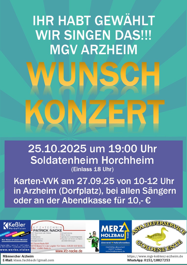 Nach dem großen Erfolg im vergangenen Jahr veranstaltet der Männerchor Arzheim am 25.10.2025 um 19:00 Uhr im Soldatenheim auf der Horchheimer Höhe sein zweites Wunschkonzert unter dem Motto „Wünsch Dir was, wir singen das!“ Freunde, Verwandte und Fans des Vereins konnten diesmal aus 20 Liedvorschlägen ihre 10 Lieblingsstücke auswählen, weitere 5 Stücke hat der Verein zusammen mit seinem Chorleiter bereits im Vorfeld festgelegt. Der Männerchor hat fleißig für das Großereignis geprobt und freut sich auf viele Besucherinnen und Besucher. Karten zum Preis von 10,- € können bei allen Sängern oder an der Abendkasse erworben werden. Dafür wird ein breites Spektrum der Chormusik vom klassischen Chorgesang über Schlager bis hin zu aktuellen Hits geboten. Der Männerchor Arzheim lädt herzlich ein und freut sich, seinem Publikum in einem gut gefüllten Saal einen wunderbaren musikalischen Abend zu bieten, der bei einem gemeinsamen Getränk und netten Gesprächen ausklingen wird. Informationen finden Sie auch unter https://www.mgv-koblenz-arzheim.de
